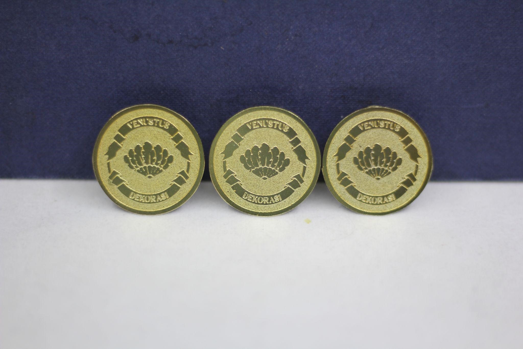 Pin adalah pin yang dibuat bentuk Custom sesuai keinginan yang dibuat dari plat kuningan biasa diletakan di dada sebagai identitas.
